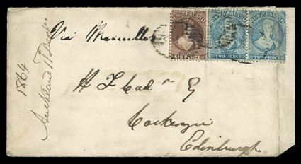 h.s., one 2d. additionally tied by large Auckland c.d.s. with a1864 (7 Dec.) envelope from Otahuhu to London, bearing 2d. Plate I worn impression (2) and 6d. red-brown all lightly cancelled with two strikes of the oval-framed "5/otahuhu/a" h.s., one 2d. additionally tied by large Auckland c.d.s. with a further strike at upper right corner, and with one 2d. additionally tied by London Paid c.d.s. (15.2), despatch c.d.s. on reverse; the adhesives lifted and hinged back in place; a delightful franking of the Maori War period. Sc. 32a, 36; S.G.113, 122. provenance: Christie's Robson Lowe, October 1989 (Image) Est. $1,000-1,500
