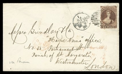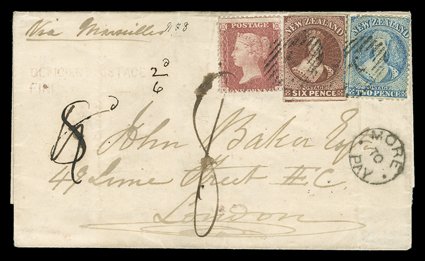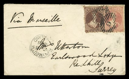 circular-framed pd and London Paid c.d.s. (1.11), all in re1869 (3 Sept.) envelope from Hoikitika to Fusio, bearing 1d. pale orange-vermilion and 3d. lilac (5) all cancelled with large "W" handstamp and showing manuscript "20" in crayon, circular-framed "pd" and London Paid c.d.s. (1.11), all in red, the reverse with despatch , Basle and Sinnasco (5.11) c.d.s., and two further Swiss namestamps; some of the adhesives with faults through originally having been affixed over edges of cover, nevertheless a remarkable franking from this office, apparently paid via Suez and the Long Sea Route to the U.K. R.P.S. Certificate (2006). Sc. 31, 33; S.G. 111, 117. Note: The cover was probably transferred to the Marseilles route due to mis-sorting. The mail via Southampton arrived on 6 November. The correct cost via Marseilles and the U.K. was 1/3d. per ¼oz. or 1/8d. per ¼-½oz. provenance: C.W. Meredith, March 1960, John Woolfe, October 2006 (Image) Est. $3,000-4,000