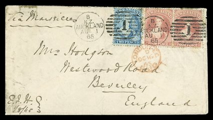 (16.10) below and just tying the adhesives, the reverse with London (16.10)1865 (1 Aug.) envelope from Auckland to Beverley, bearing 2d. pale blue Plate I worn and 4d. deep rose horizontal pair twice cancelled with "1" duplex, London Paid c.d.s. (16.10) below and just tying the adhesives, the reverse with London (16.10) and Beverley (17.10) c.d.s.; the envelope with a few light fox marks around the adhesives though a rare and most attractive franking of the 10d. rate. Sc. 32a, 34; S.G. 119, 122. provenance: Christie's Robson Lowe, October 1989 (Image) Est. $1,500-2,000