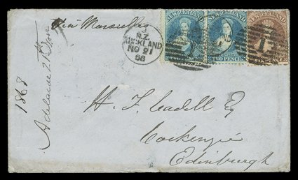 envelope with two small tears at lower right corner, otherwise clea1865 (18 Dec.) envelope from Dunedin to Edinburgh, bearing 4d. deep rose and 6d. red-brown twice neatly cancelled with "otago" duplex, arrival c.d.s. (13.2) on reverse; the envelope with two small tears at lower right corner, otherwise clean and most attractive. A scarce franking. Sc. 34, 36; S.G. 119, 122. (Image) Est. $1,500-2,000