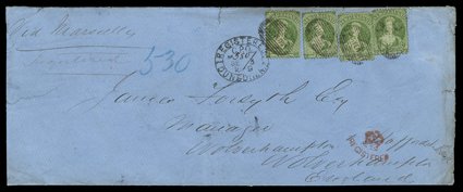 2415 c   1869 (3 Sept.) triple blue envelope (249x100m.) registered from Dunedin to Wolverhampton, bearing 1- green (4) each cancelled with dunedin in oval of bars and one additionally