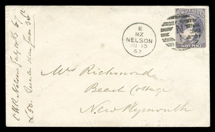 right, neatly cancelled N1 in oval of bars, despatch c.d.s. alongsid1867 (10 June) envelope from Nelson to New Plymouth, bearing 3d. lilac with good to large margins on three sides, touched at top and with fractionally rounded corner at lower right, neatly cancelled "N/1" in oval of bars, despatch c.d.s. alongside the cancellation and with arrival c.d.s. (11.7) on reverse. Rare. Sc. 33c var.; S.G. 117a var. provenance: Gerald Ellott (Image) Est. $750-1,000