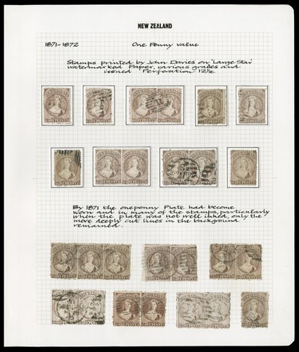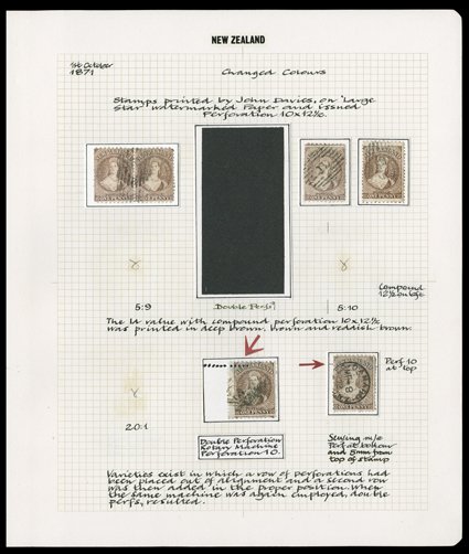 of perf. 10 at top) and perf. 12½ (26 with a strip of three and eight p1d. used collection on leaves comprising perf. 10 (4 with a pair), perf. 10x12½ (7 with two pairs), perf. 10 compound with 12½ on one side (5 with one showing part double row of perf. 10 at top) and perf. 12½ (26 with a strip of three and eight pairs); generally fine. Sc. 38, 39, 42; S.G. 126, 128, 128a, 132, 132a, £2,755+. provenance: Gerald Ellott (imagea) (imageb) (Image) Est. $1,000-1,500