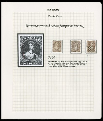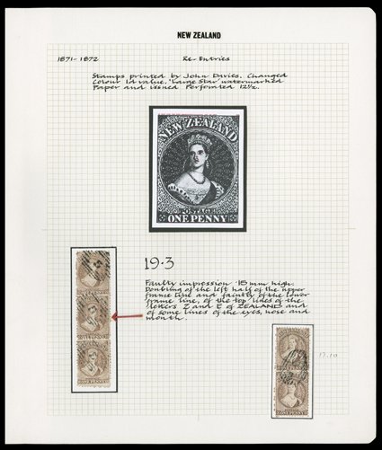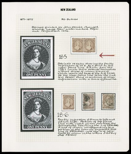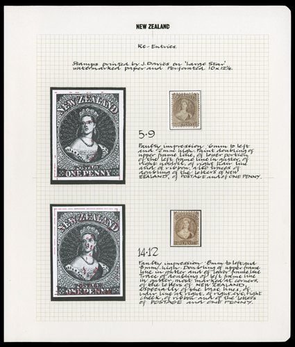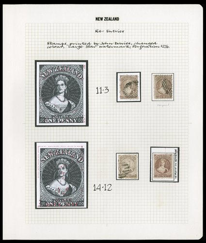one compound perf.), 1412 perf. 12½ (2, one mint), 1710 perf. 12½1d. collection of re-entries, comprising Row 5/8 perf. 12½, 5/10 (2, one perf. 12 mint and one compound perf. used), 5/9 and 14/12, both perf. 10x12½, 11/3 (2, one perf. 12½ and one compound perf.), 14/12 perf. 12½ (2, one mint), 17/10 perf. 12½ in pair with 18/10, 18/5 perf. 12½ in pair with 18/4, mint, 18/6 perf. 12½ (3, one unused), 19/3 in perf. 12½ vertical strip with 18/3 and 20/3, and 20/1 perf. 10 and (2, one unused); generally fine. Cat. £2,620. provenance: Gerald Ellott (imagea) (imageb) (imagec) (imaged) (imagee) (Image) Est. $1,000-1,500