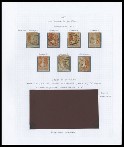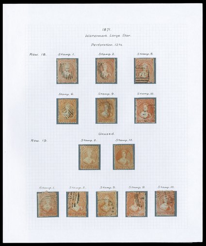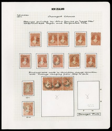 strip of three and a pair both with one retouched and a single with plate2d. collection on leaves, comprising Orange perf. 10x12½ (10 with two showing double perfs. and two retouched), perf. 12½ (15 with a strip of four cancelled "8" on piece, a strip of three and a pair both with one retouched and a single with plate flaw Row 4/4), and Vermilion (15 with a strip of three, one retouched, a pair, and two retouched); generally fine. Sc. 40, 40a, 43; S.G. 130, 133, 134, c. £1,420. provenance: Gerald Ellott (imagea) (imageb) (Image) Est. $500-750