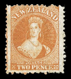 rare. Unlisted in Scott S.G. 122b, £2,250.6d. red-brown horizontal pair with just clear to enormous margins and showing small portion of adjoining stamp at left, lightly cancelled with Christchurch duplex; fine and rare. Unlisted in Scott; S.G. 122b, £2,250. (Image) Est. $750-1,000
