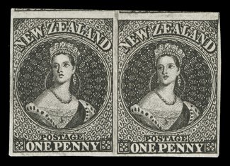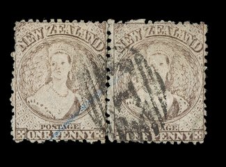 and exceptionally rare. R.P.S.N.Z. Certificate (1959). Sc. 45 S.G.1d. brown with watermark inverted and reversed, a severed and rejoined horizontal pair sharing a single strike of the "1" obliterator and with light blue crayon mark. Attractive and exceptionally rare. R.P.S.N.Z. Certificate (1959). Sc. 45; S.G. 140, £12,000. provenance: Colin Mc.Naught, Gerald Ellott (Image) Est. $8,000-10,000