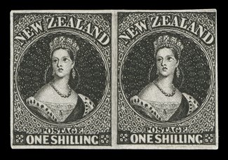 Ellott1855 original plate proofs in black on medium thick, wove, unwatermarked paper, comprising 1d. and 1/- horizontal pairs and 1/- block of four; fine. provenance: Gerald Ellott (imagea) (imageb) (Image) Est. $500-750