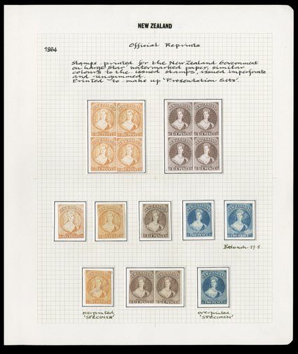 specimen (Type B) generally fine. provenance: Gerald E1884 reprints, comprising 1d. orange (7 with a block of four), 2d. blue (3, one Row 17/8 with retouch) and 6d. brown (7 with a block of four), one 1d. and one 2d. handstamped "specimen" (Type B); generally fine. provenance: Gerald Ellott Note: These stamps were used to make up presentation sets. (imagea) (Image) Est. $300-400