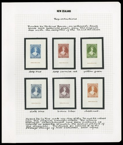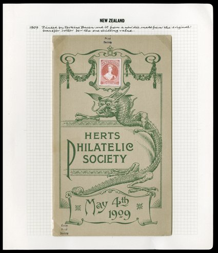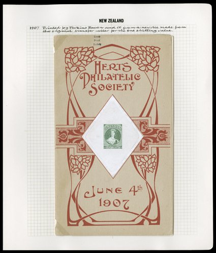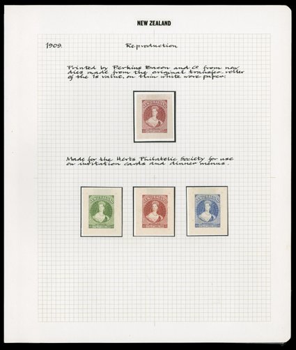 above and below, in carmine, blue, black and brown, and with single wavA collection of Trade Samples on thin card made from new dies from the original transfer roller of the 1/- value, comprising value tablet with three way lines with half moons above and below, in carmine, blue, black and brown, and with single wavy line with dots above and below in black, orange, blue-green (2), brown, blue and carmine; Herts Philatelic Society 1907 dinner menu with design in green on surfaced paper affixed to cover, and 1909 dinner menu proofs on wove paper in carmine, green, red, blue and a further example on thin card affixed to menu; 1950 reproductions of the six values as reproduced in Volume II of the "Postage Stamps of New Zealand" handbook, each on thin card (37x53mm.) with imprint below. A fine and colorful assembly of these attractive items. provenance: Gerald Ellott (imagea) (imageb) (imagec) (imaged) (Image) Est. $500-750