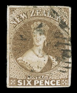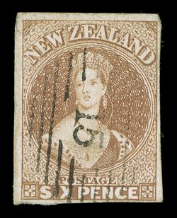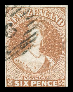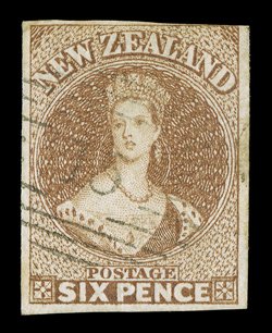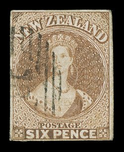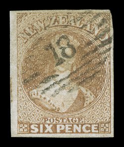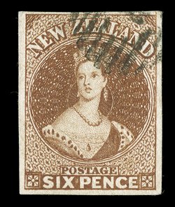 6d. chestnut on hard paper, good to large margins and clearly cancelled "18" at Otago; tiny patch of discolouration at upper right corner, otherwise sound. Sc. 9f; S.G. 15, £550.