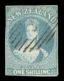 1/- blue-green on hard paper, a bluish shade with good to large margins and neatly cancelled "15" at Nelson; trace of a thin, otherwise sound. Sc. 10; S.G. 17, £1,700.