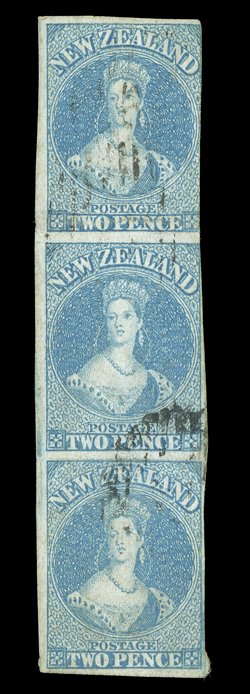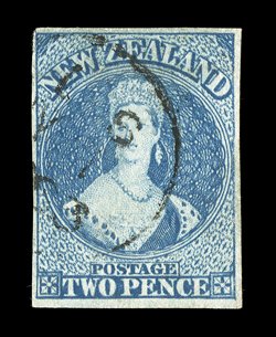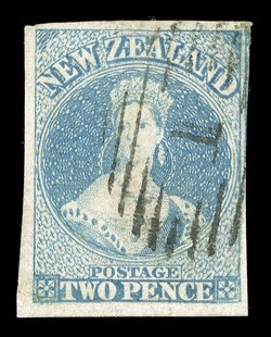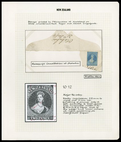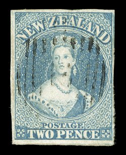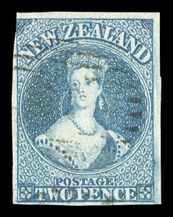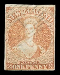 1/- emerald-green on soft paper, showing dry ink impression at right, good to large margins, neatly cancelled "1" at Auckland, good colour and fine. Holcombe Certificate (1985). Sc. 10a; S.G. 16, £1,700. (Image) |