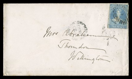adjoining stamps (vertical crease at right), cancelled (not tied) "6" and with Petre arrival c.d.s. (5.10) at left, and 1860 (25 Apr.) envelope from Auckland to Wellington bearing 2d. blue with margins on three sides and cancelled "1", arrival c.d.s.