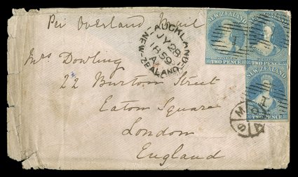 cancelled 1 and with fine despatch c.d.s. alongside, London mso1859 (28 July) envelope (flap missing and some faults) from Auckland "Per Overland Mail" to London, bearing 2d. pale blue (3) with margins in places (one defective), each cancelled "1" and with fine despatch c.d.s. alongside, London "m/so/a" circular missent mark additionally tying one of the adhesives, arrival c.d.s. (14.10) on reverse. Sc. 8e; S.G. 9. provenance: Gerald Ellott (Image) Est. $150-200