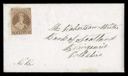 being missing, margins elsewhere in places, clearly cancelled 15 and tied6d. brown on soft paper, a marginal example from the top of the sheet showing fine overlap at top of the design resulting in the frame line and other traces of the design being missing, margins elsewhere in places, clearly cancelled "15" and tied on 1861 (11 July) entire from Nelson to Glasgow, the reverse with despatch and arrival (20.9) c.d.s.; the adhesive with a small corner crease and the cover creased and rather stained though a very rare usage of these unusual stamps on cover. Sc. 9; S.G. 13. (Image) Est. $2,000-3,000
