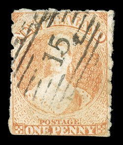 £5,500.1d. dull orange with roulettes on three sides and neatly cancelled "15" at Nelson; some thins though of good appearance. R.P.S. Certificate (1925). Sc. 7a group; S.G. 18 group, £5,500. (Image) Est. $750-1,000