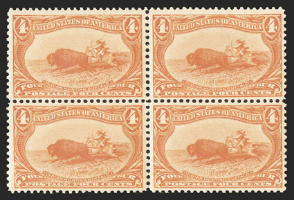 339 nhbl 287 287, 4c Trans-Mississippi, an especially choice mint block of four, incredibly fresh, excellent centering, vivid rich color, pristine o.g., n.h., very fine-extremely