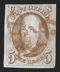 certificate.#1, 5c Red brown, three large margins, close at top, bright color and a fine impression, cancelled by a scarce bright red Paid 5 postmark, nearly very fine; 2009 PSE certificate. (Image) $600.00