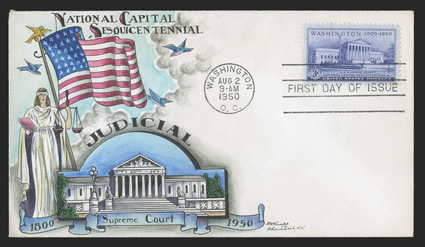 extremely fine and handsome.#991, 3c Supreme Court Building, tied by "Washington, D.C./Aug 2, 1950" first day of issue postmark to Dorothy Knapp multicolored handpainted cover, unaddressed and fresh, extremely fine and handsome. (Image) Est. $150-200