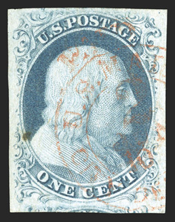 design shows, distinctive powder blue color typical of the plate one e#5A, 1c Blue, Ty. Ib, position 5R1E, handsome used example of this very rare stamp, featuring large to huge margins on three sides, fourth margin at right close but the full design shows, distinctive "powder blue" color typical of the plate one early printings, excellent impression on bright white paper, neat portion of large town c.d.s., very fine; 1988 PF certificate. (Image) $10,000.00