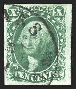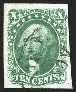 portion of a Mobile, Ala. c.d.s., extremely fine and choice 2009 PF cer#10A, 3c Orange brown, Ty. II, gorgeous used single, featuring lavishly large margins all around, brilliantly rich color and a well incised impression, neatly cancelled by a portion of a Mobile, Ala. c.d.s., extremely fine and choice; 2009 PF certificate. (Image) $150.00