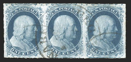 and perfectly balanced margins all around, deep luxuriant color#7, 1c Blue, Ty. II, a magnificent horizontal strip of three, positions 56-58R2, with the right stamp showing both a double transfer and a small plate crack at top right, lavish and perfectly balanced margins all around, deep luxuriant color and a wonderfully detailed impression, very light and unobtrusive town cancels, accompanying certificate mentions "tiny creases at top" which appear nothing more than trivial natural usage bends, still extremely fine; a marvelous showpiece for the One Cent Blue specialist; 1969 (clear) and 2002 PF certificates. (Image) $575.00+