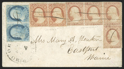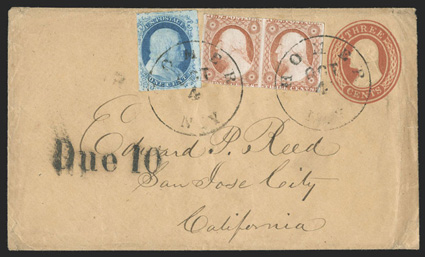 bottom, plus its color and impression are spectacularly intense on brigh#10A, 3c Orange brown, Ty. II, an absolutely superb top sheet-margin horizontal pair, with large margins all around, including showing small parts of the adjoining stamps at bottom, plus its color and impression are spectacularly intense on bright fresh paper, beautifully tied to an immaculate buff colored cover to Vermont by a "Sacramento City, Cal./1 Mar" balloon c.d.s., small bit of back flap missing, extremely fine; a gorgeous cover in optimal quality; 1989 PF certificate as #10, before the two types were differentiated in Scott.; ex-Lehman, Renard. (Image) Est. $1,500-2,000