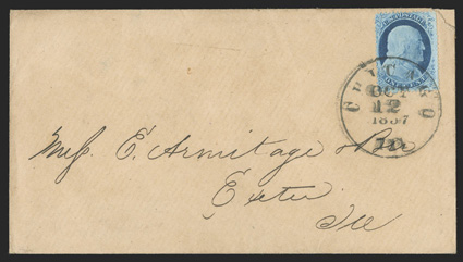 datelined Lawrenceburg Apr. 21st, 1855, very fine 2010 PF certifi#11, 3c Dull red, ample to large margins all around, tied by blue "Indianapolis & Cincinnati R.R./Apr 28" route agent's postmark to cover to Terre Haute, Indiana, with enclosure datelined "Lawrenceburg Apr. 21st, 1855," very fine; 2010 PF certificate. (Image) Est. $300-400