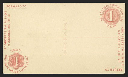 unusual, very fine also accompanied by the paid reply postal caUndersander #E801, 3c Red on white Marshall patented return stamped envelope essay, with preprinted return address, showing inverted second reply impression of the indicia, most unusual, very fine; also accompanied by the paid reply postal card version which is also unusual and scarce, very fine pair. (imagea) (Image) Est. $300-400