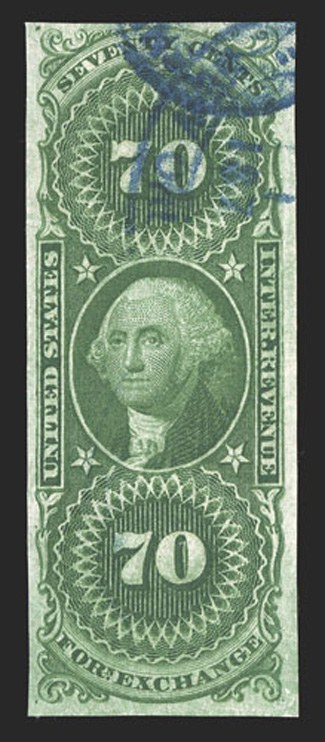to the upper right, very fine and attractive.#R65a, 70c Foreign Exchange imperforate, ample to mostly large margins all around, rich verdant color on fresh white paper, used with face-free blue handstamped cancel confined to the upper right, very fine and attractive. (Image) $600.00