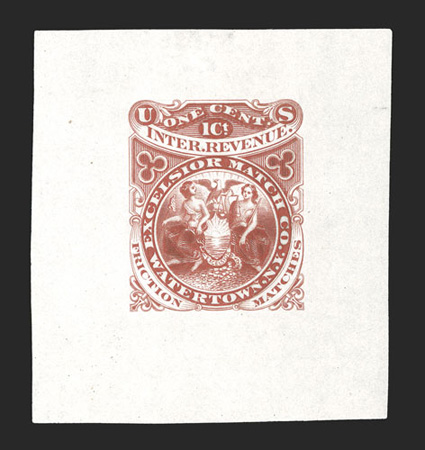 fine ex-Joyce.#RO81P1, Excelsior Match Co., Watertown, N.Y., 1c Black large die proof on India paper mounted on full sized card measuring 151x228mm, mounted on Joyce album page, extremely fine; ex-Joyce. (Image) $175.00