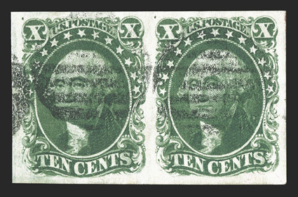 trivial small surface scuff in margin below T of CENTS on right stamp,#14, 10c Green, Ty. II, horizontal pair, used, exceptionally large and wonderfully well balanced margins all around, deep luxuriant color and impression, light grid pmks., trivial small surface scuff in margin below "T" of "CENTS" on right stamp, otherwise extremely fine and quite choice; 1976 (clear) and 2006 PF certificates. (Image) $450.00