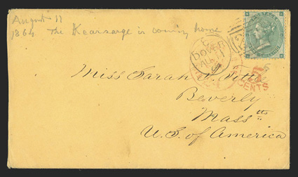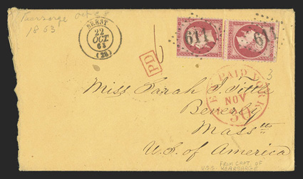 others are U.S. franked with 65, a few with scarce ship markings includU.S.S. Kearsarge cover lot of sixteen pale buff covers, 1862-1864, thirteen of which have "Kearsarge" pencil docketing, includes four from Great Britain and two from France, others are U.S. franked with #65, a few with scarce ship markings including one with "New York Ship/Jan 19" c.d.s., both French covers have depreciated currency exchange office postmarks, mostly fine. (imagea) (imageb) (Image) Est. $400-500