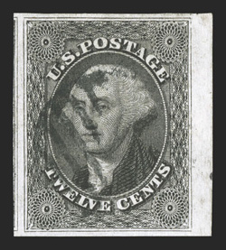 featuring prooflike color and a highly detailed impression on crisp cle#17, 12c Black, an extraordinarily choice and incredibly fresh mint single, boasting and overall freshness and brilliance rarely encountered on this terribly difficult stamp, featuring prooflike color and a highly detailed impression on crisp clean paper, four exceptionally large and equal margins, especially for this tightly spaced issue, including a bit of the adjacent frame line at right, while its reverse reveals full clean original gum that has only been lightly hinged, an extremely fine gem; the 1851 Twelve Cent Washington is one of the most challenging of all the early classics to locate in mint, let alone premium quality such as this, and to find one still retaining its full original gum is a rare occasion indeed; 1998 PF certificate and 2005 PSE certificate (XF 90; SMQ $11,800.00). (Image) $6,250.00
