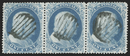 88 O 18 18, 1c Blue, Ty. I, used horizontal strip of three, strong color and impression, nicely centered, grid cancels, very fine a scarce multiple 2008 PF certificate.#18, 1c Blue, Ty. I, used horizontal strip of three, strong color and impression, nicely centered, grid cancels, very fine; a scarce multiple; 2008 PF certificate. (Image) $2,600.00