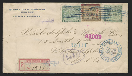 registry label with number written by hand, and Cristobal rubber stam#14, 8c on 50c Bister brown, single along with two 1c Green (#9) tied by blue cancels with matching Cristobal Oct 27, 1905 registry handstamp on cover to Philadelphia, with registry label with number written by hand, and Cristobal rubber stamp, New York and Philadelphia registry backstamps, cover with minor edge wear, fine. (Image) Est. $200-300