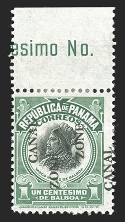 Canal Zone overprint errors, with only two examples ever printed#46c, 1c Green and black, "Zone" double, top right corner margin single, being position 10 on the sheet, attractive colors, o.g., very fine; this is one of the rarest of all the Canal Zone overprint errors, with only two examples ever printed (the other is the ex-Plass copy); this error occurred on a sheet with "Canal Zone" doubly printed, but due to the placement of the second overprint, two positions on the sheet (10 and 20) received only the "Zone" overprint; 1983 APS certificate (CZSG #46c) (Image) $4,250.00