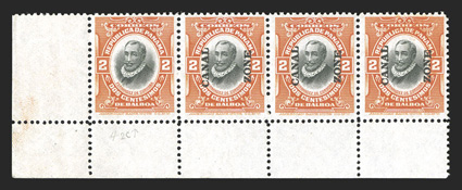 colors, o.g., lightly hinged, fine-very fine only twenty such erro#56d, 2c Orange vermilion and black, horizontal pair, left stamp without overprint, bottom left corner margin strip of four, the left stamp lacking the overprint, lovely bright colors, o.g., lightly hinged, fine-very fine; only twenty such error pairs were made (CZSG #56c.II). (Image) $1,250.00