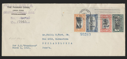 Cristobal, Mar 1, 1915 duplex, sent to Philip Ward in Philadelphia, regist#42-45, 1c-10c Pictorials cplt., each a left sheet-margin single (10c bottom left margin single) neatly arranged and tied to a registered legal size first day cover by Cristobal, Mar 1, 1915 duplex, sent to Philip Ward in Philadelphia, registry backstamps of Cristobal, New York and Philadelphia, very fine; a scarce complete set on first day cover. (Image) Est. $400-500
