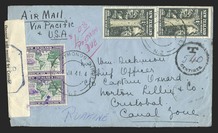 few WWII censored, also includes three postage due forms from 1972 with#J25-29, 1c-15c Claret cover lot of eleven covers and one postage due form, some overseas inbound mail including Australia and New Zealand (two, one with a total of $1.08), a few WWII censored, also includes three postage due forms from 1972 with ordinary stamps tied and one 1975 cover with ordinary stamp used as postage dues. (Image) Est. $150-200