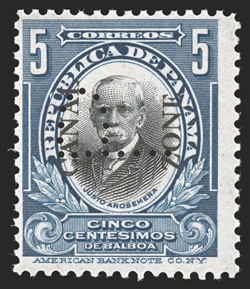 1158 ogO   Perfin balance consisting of 59 "P" perfins on a wide variety of stamps, from Scott #37 to 135, plus fourteen air posts, mostly different stamps, twenty are in the ANBC period, thirteen are the 1924-25 U.S. overprints including a used block of four of #86, in addition there are 33 with Pacific Steam Navigation perfins, and three other perfins including a U.S. 1c Washington-Franklin with Panama Railroad Co. perfin (mint), most are fine or better; an unusually large offering of these scarce perfins. Est. $500-750