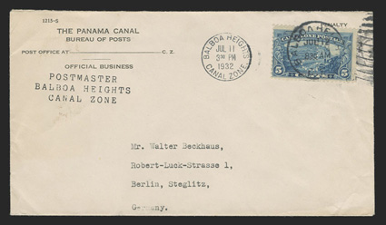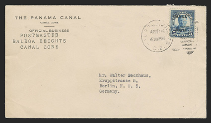 so apparently this was sent out without postage and returned th#107 var., 5c Blue, with "P" perfin, single with inverted "P" tied by Balboa Heights July 12 duplex on a penalty cover to Germany, with additional Balboa Height c.d.s of July 11, so apparently this was sent out without postage and returned the next day, as the 5c was required for foreign mail, fine and quite scarce (CZSG #107.PP). (Image) Est. $300-400