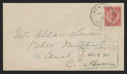 and Pedro Miguel, fine a scarce marking."Advertised/Pedro Miguel, C.Z./May 1 1913/Unclaimed", boxed handstamp on cover originating in Jamaica, with New Port c.d.s. tying 1c Carmine stamp, backstamps of New Port, Kingston and Pedro Miguel, fine; a scarce marking. (Image) Est. $150-200