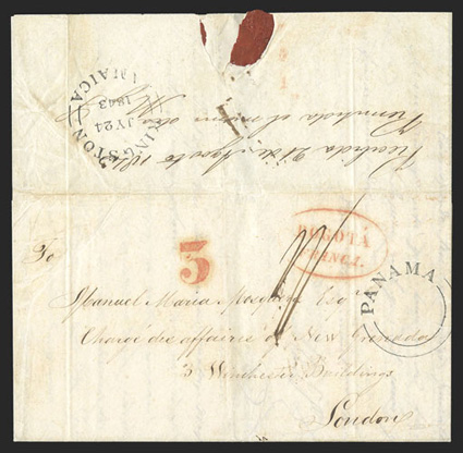 matching 3 centavos internal rate handstamp, manuscript 1- singleBogota, Columbia to London, folded letter datelined 30 June, 1843 with British Post Office "Panama" double arc undated circular postmark, red oval "Bogota/Franco" postmark and matching "3" centavos internal rate handstamp, manuscript "1/-" single rate to London, split circle "Kingston, Jamaica/Jy 24, 1843 transit backstamp, very fine; fewer than seven examples of this "Panama" postmark are recorded in black by DeVoss. (Image) Est. $750-1,000