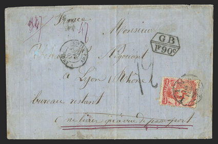 without a passport, red LondonMr 16, 68 transit backstamp and hexaLima, Peru to Lyon, folded cover franked by Peru 1866-67 10c Vermilion (#17) tied by "Lima/13 Feb, 868" datestamp and bearing special instruction in French "not to be released without a passport," red "London/Mr 16, 68" transit backstamp and hexagonal "GB/1F90c" accountancy handstamp, Calais entry datestamp with "19" decimes due, Paris and Lyon backstamps as well as straightline "Non Reclame," fine and unusual. (Image) Est. $200-300