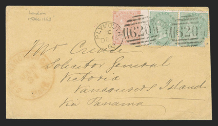 missing) tied by two strikes of PlymouthDe15, 62 duplex, red LondU.K. to Victoria, Vancouver Island, cover with "Via Panama" directive franked by horizontal pair 1856 1/- Green (#28, one with corner missing) and 1862 4d Vermilion (#34, corner missing) tied by two strikes of "Plymouth/De15, 62" duplex, red London transit backstamp and red "San Francisco/Paid/Jan 32" transit, very fine; addressed to Mr Crease, who neither lived in Victoria (he moved to New Westminster in 1861) nor was Solicitor General of the island. (Image) Est. $150-200