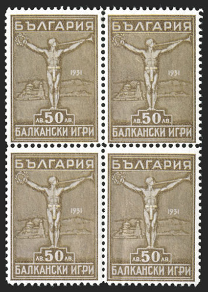fine.#237-243, 1931 1l-50l Balkan games cplt, fresh mint blocks of four, generally well centered, o.g., n.h., one 6l with a light paper adhesion on gum, otherwise fine-very fine. (Image) for hinged $655.00