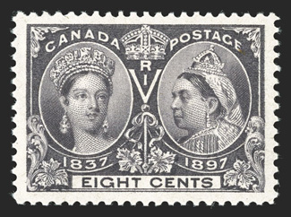 1992 Greene Foundation certificate (Unitrade C$600.00).#57, 1897 10c Jubilee, exceptionally well centered amid uncharacteristically large margins, deep intense color and a strong vivid impression, o.g., n.h., an extremely fine gem; 1992 Greene Foundation certificate (Unitrade C$600.00). (Image) $300.00