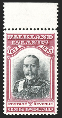 2009 Ceremuga certificate (S.G. 138 for hinged £1,900).#76, 1933 £1 Centenary, an exceptionally fresh top sheet-margin single, rich vibrant colors on pristine white paper, o.g., never hinged (hinged in the selvage only), very fine; 2009 Ceremuga certificate (S.G. #138; for hinged £1,900). (Image) for hinged $2,000.00